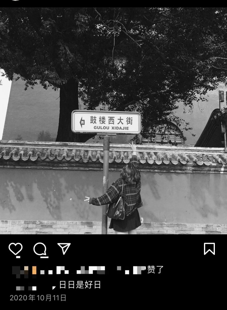 那次约拍结束后,我挑了一张照片发在了社交媒体上。是一张黑白滤镜的照 片,我背对镜头,垫着脚在鼓楼大街的路牌下比耶,文案是“日日是好日”。